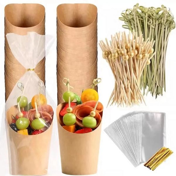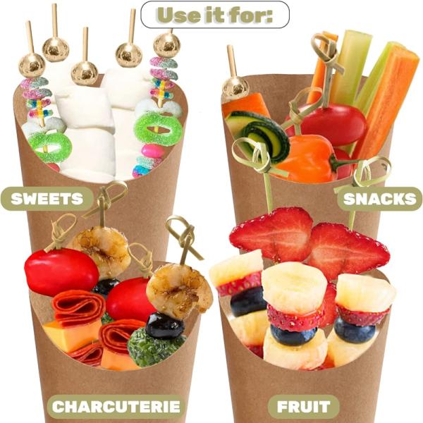 Each kraft paper cup is designed with a polyethylene oil-resistant lining for resistant to leaking and moisture penetration, these brown party cups prevent oil from staining guests' hands, keep hands cool and dry. The charcuterie cups can be used as treat cups or individual containers.